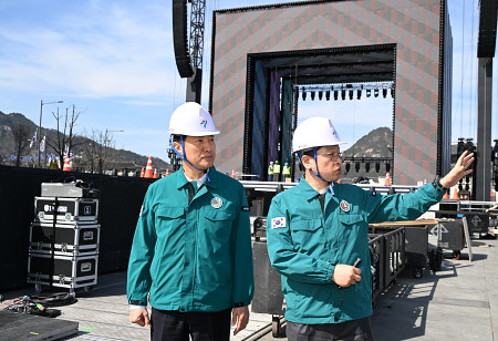 韓国の7人組男性音楽グループ「BTS」が21日にソウル市中心部の光化門広場で復活公演を開くのを前に、呉世勲市長(左)らが19日、現場の安全点検を行った=市提供 【時事通信社】