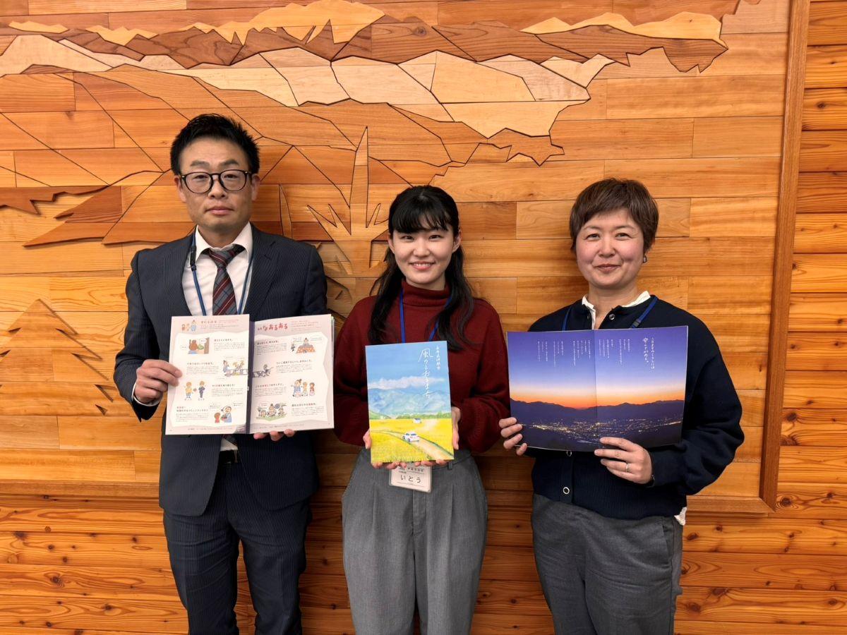 新たに制作した移住パンフレット「風のとおるまち」を手にする(左から)村田和也さん、伊藤汐里さん、藤井香織さん