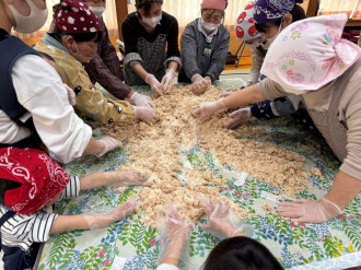 有機栽培の大豆と米こうじを使った手仕込みのみそ作りを体験できる同イベント。農園管理人の羽場友理枝さんは「農園では、普段から地域の人や移住者などが集まり、農や食を通じた交流を行っている。みそは仕込んだ年の夏の暑さや気候の違いで発酵の具合が変わったり、年数を重ねるごとに塩味がまろやかになったりするのが面白いところ。農園で仕込んだ3年分のみそも試食してもらい、味わいの違いや持ち帰った後の寝かせる目安などもイメージしてもらう」と話す。参加者は原材料となる大豆を煮るところから体験する。その後、煮た大豆をつぶし、米こうじと塩を混ぜ合わせてみそを仕込む。