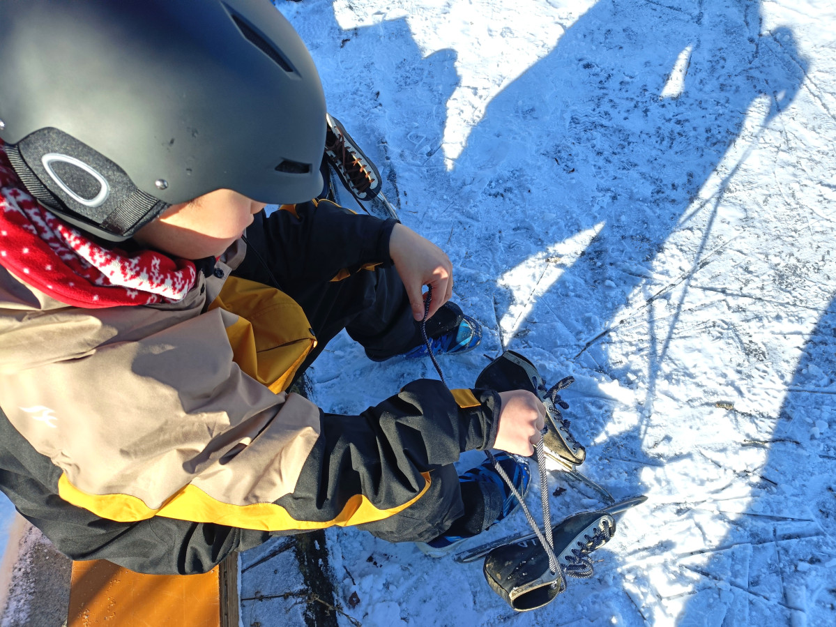 スケート靴を履く地元小学生(上古田グラウンド町営スケート場)