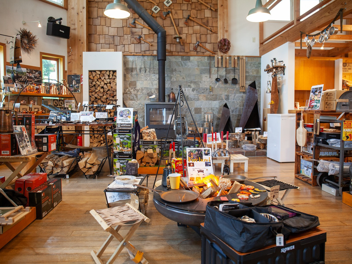 駒ケ根市にある「FIRESIDE(ファイヤーサイド)」ではたき火やまきストーブなどの商品を取りそろえる