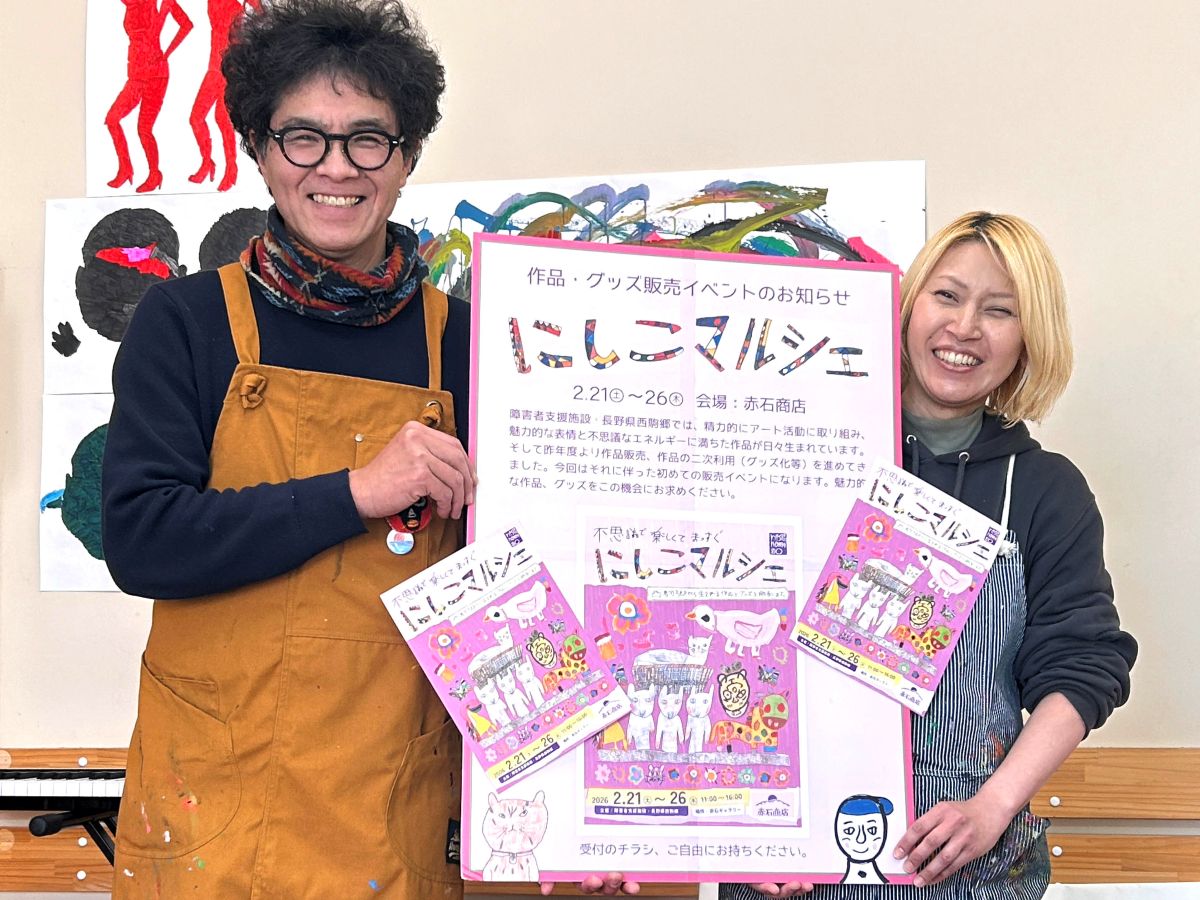 福祉施設「西駒郷」(駒ケ根市下平)の利用者の作品やグッズを販売する「にしこマルシェ」が2月21日から、「赤石商店ギャラリー」(伊那市東春近)で開催される。