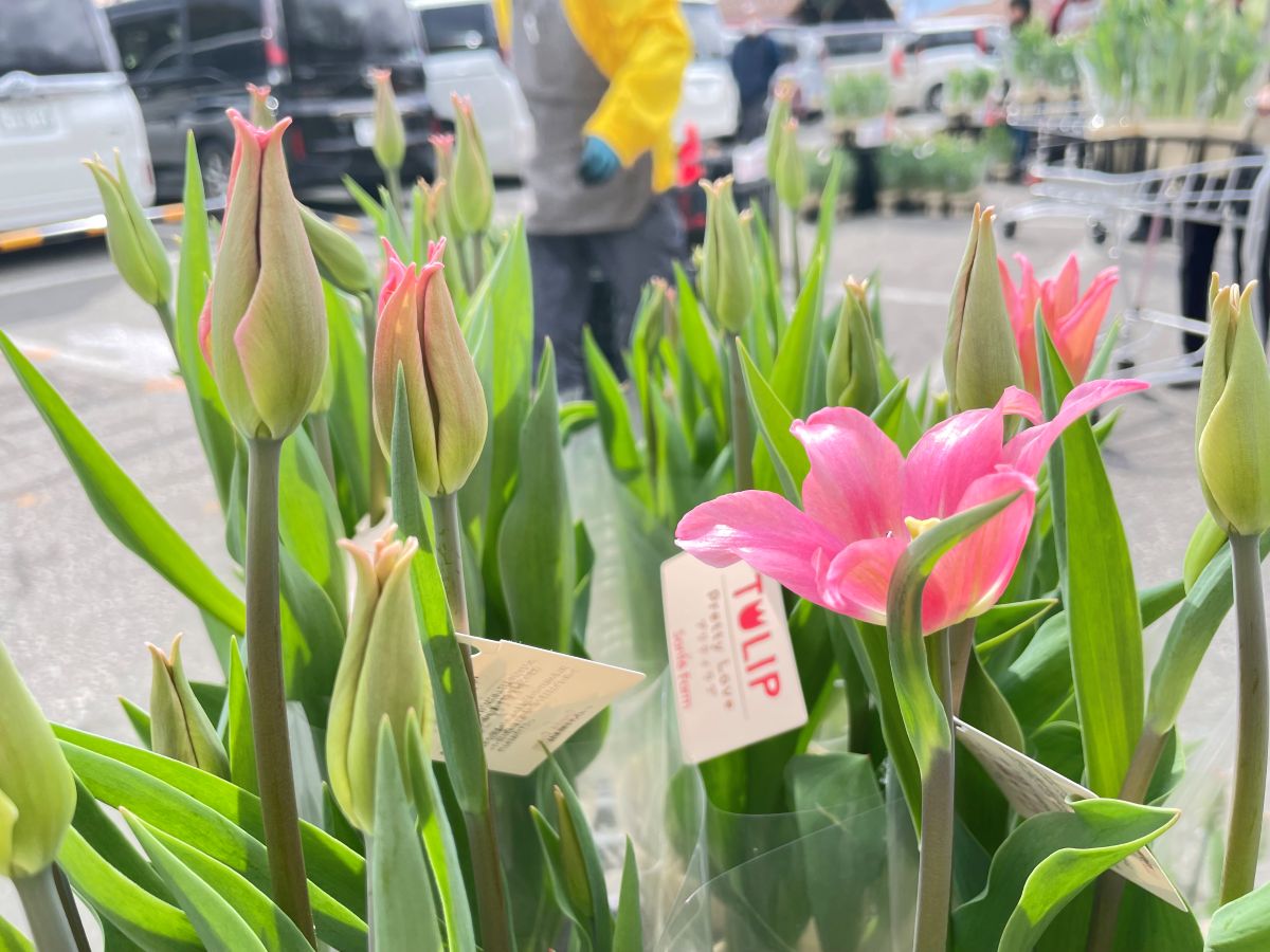 品種ごとにまとめているため、開花前でも品種を選ぶことができる(チューリップ祭り)
